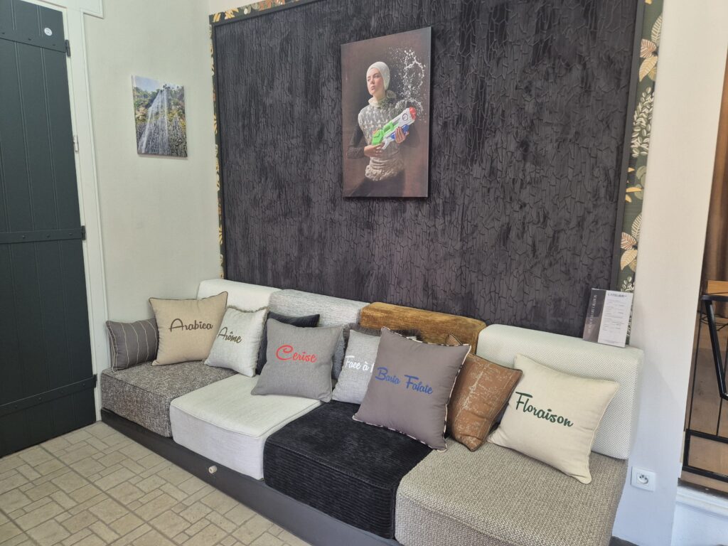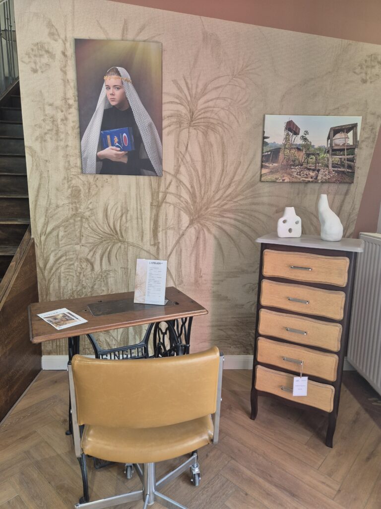 D’un côté, Laurence, artisan couturière, spécialisée dans la confection de rideaux, voilages, stores et coussins sur mesure.